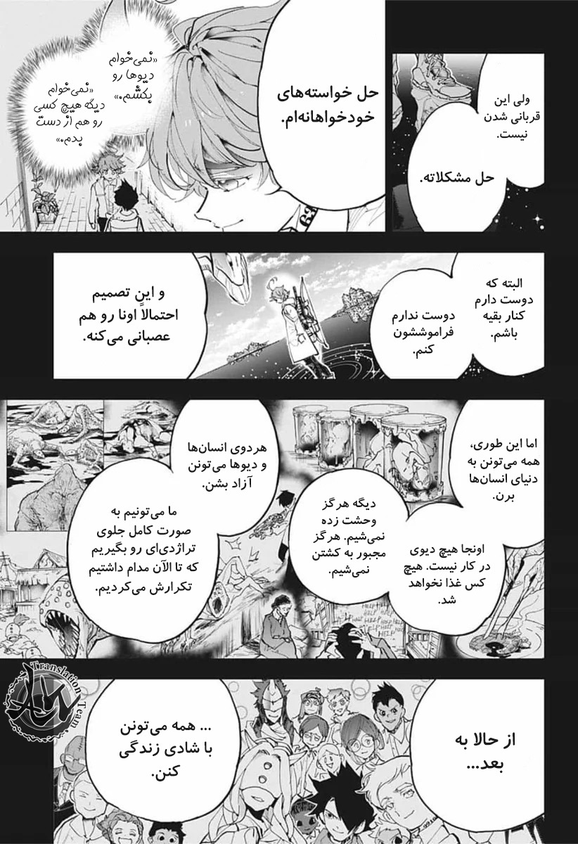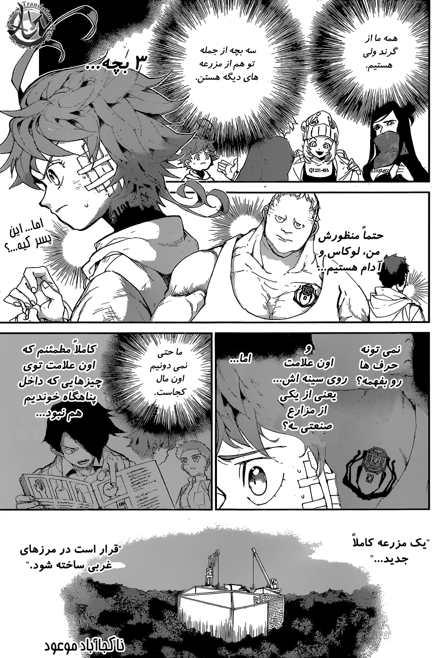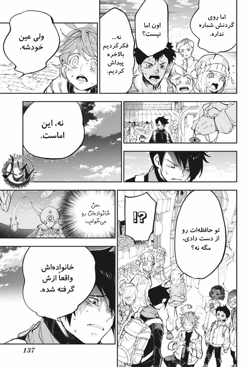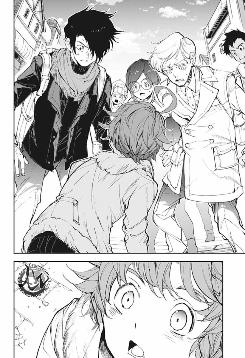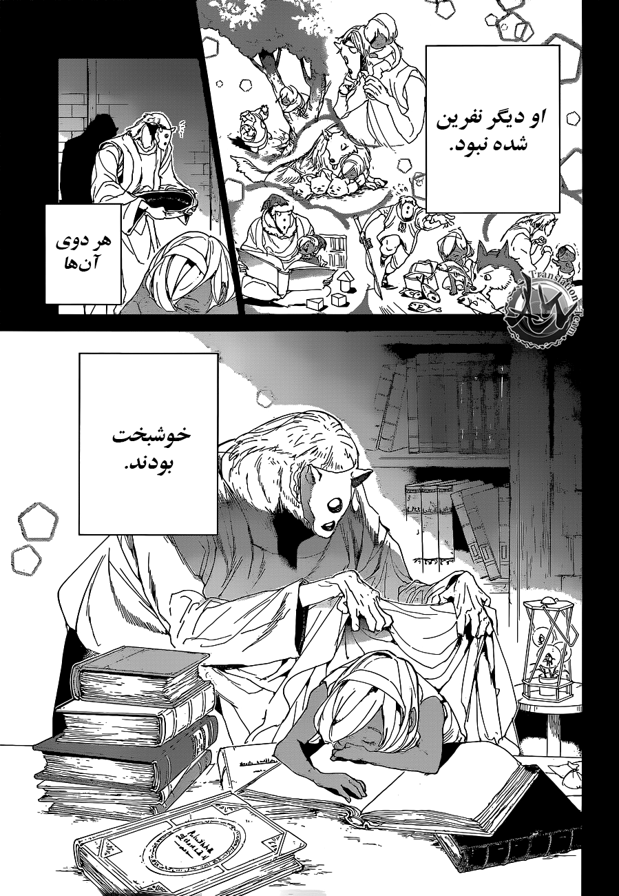 ولی ری میفهمه که اما از نقشه ی نورمن خوشش نیومده و میرن با نورمن حرف بزنن درست مثل انیمه اما فرقش اینه که توی انیمه میرن دنبال موجیکا و سونجو بگردن اما توی مانگا میرن به هفت دیوار و اگه بتونن پیمان جدید ببندن نورمن بیخیال نقشش میشه.